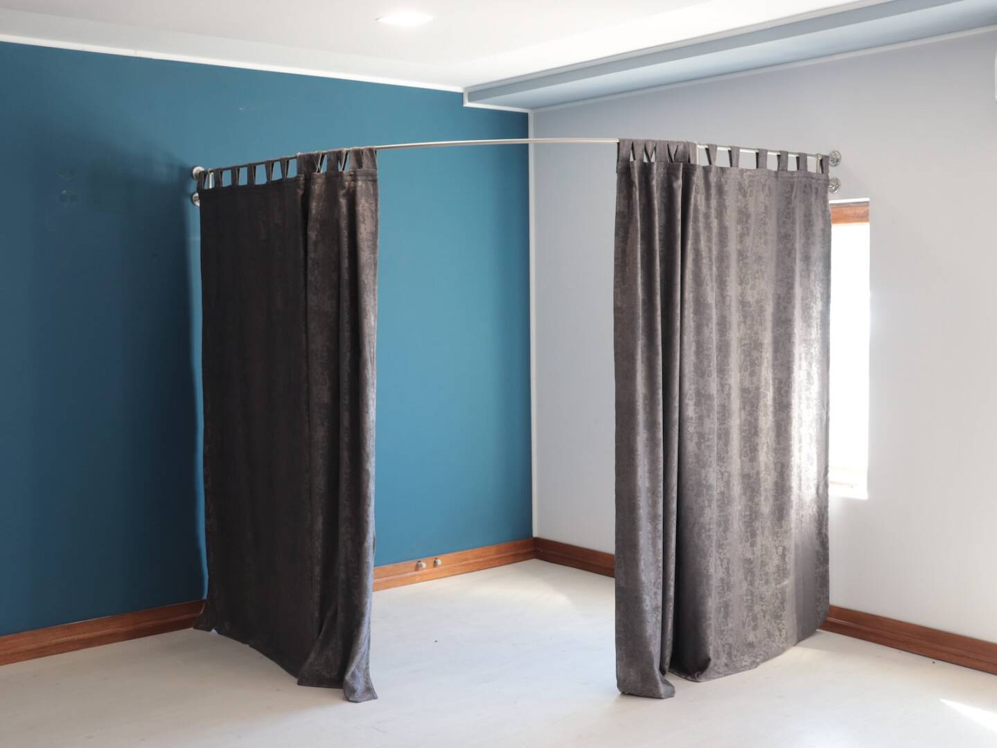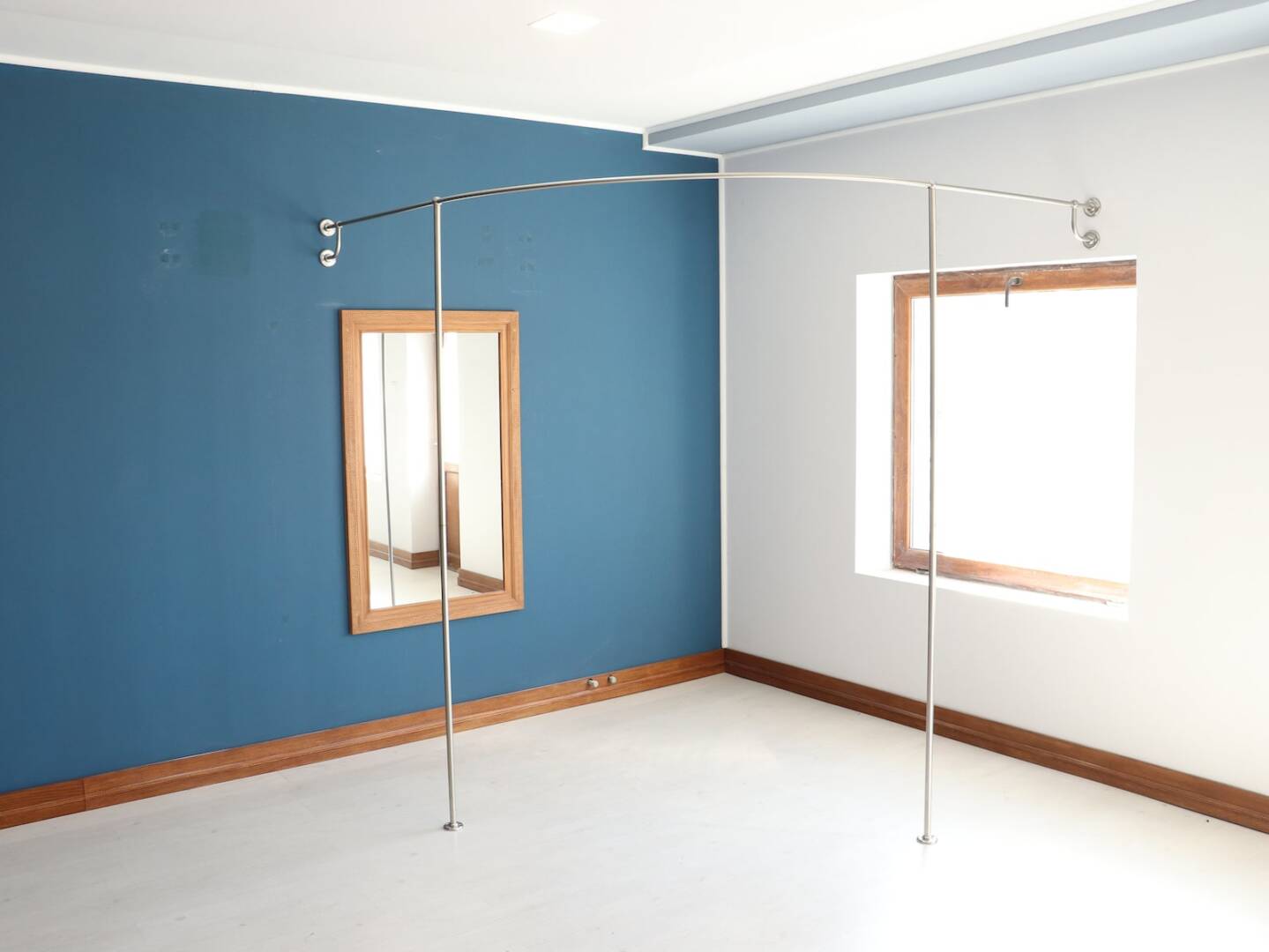 This is a dressing room model for installation in the corner between two walls. The design is practical and provides maximum space when closing the corner with a curtain.