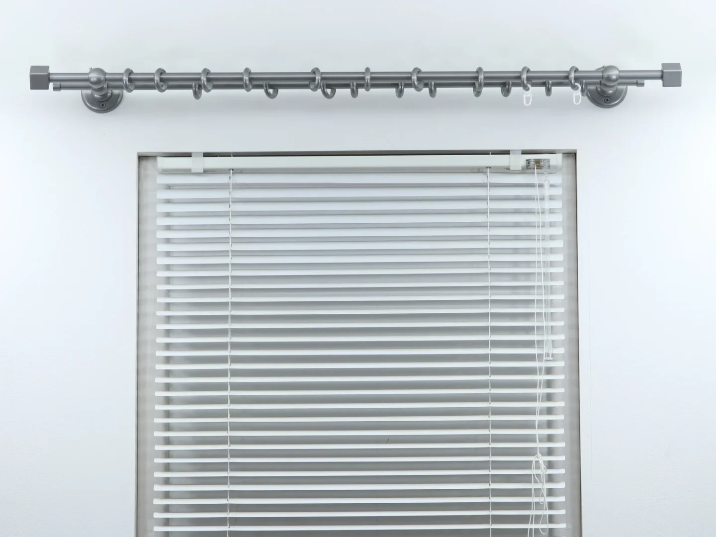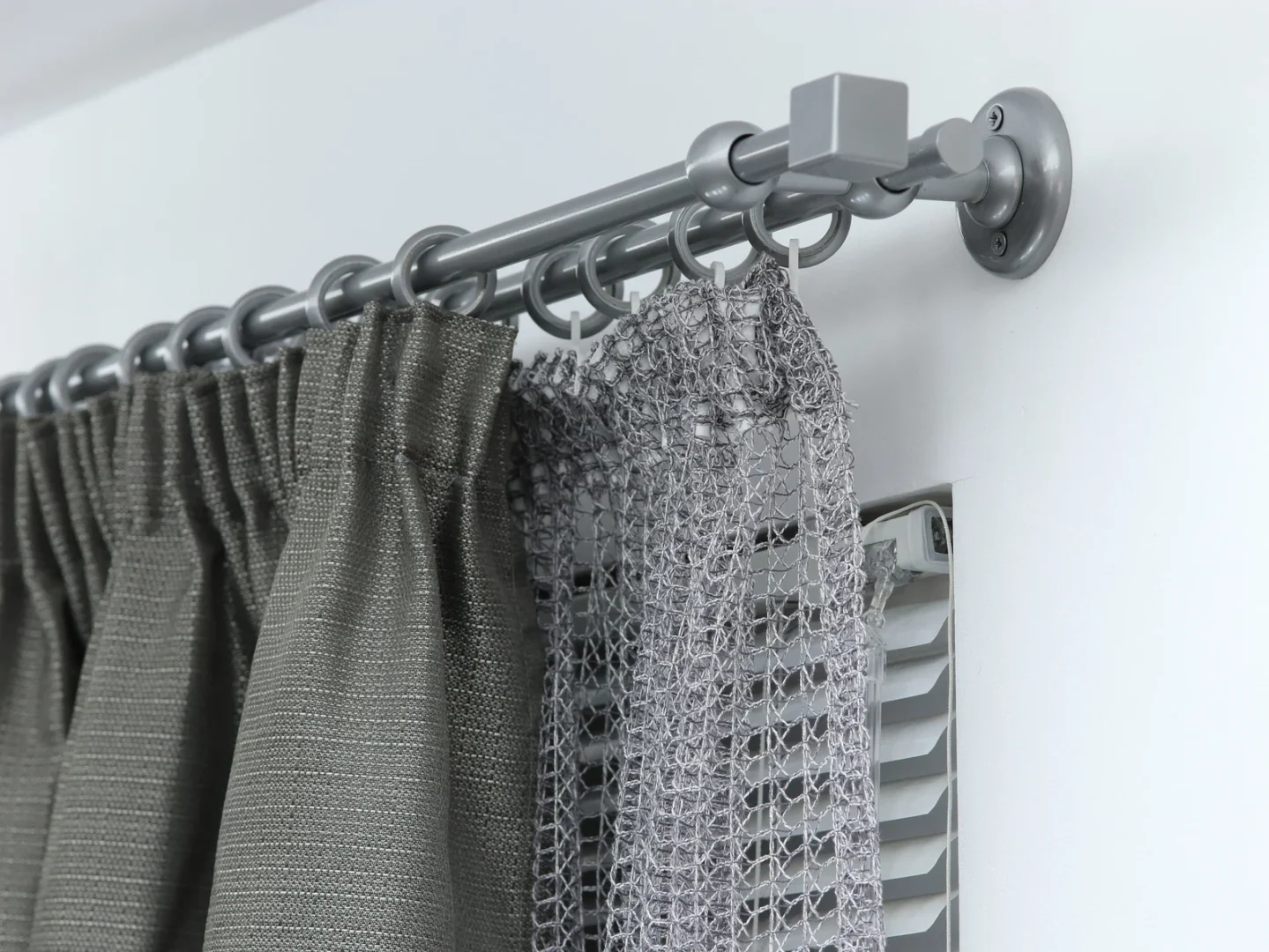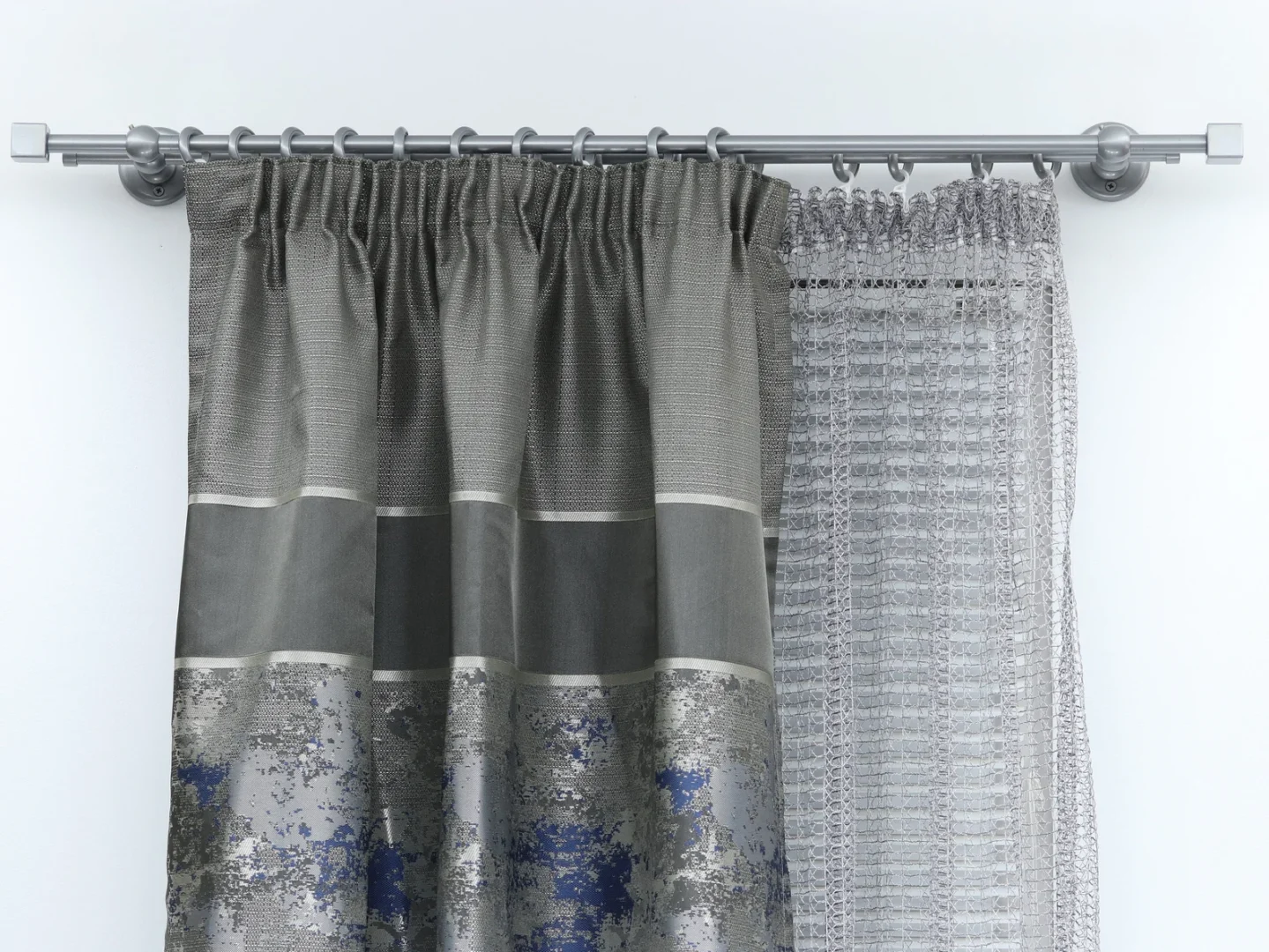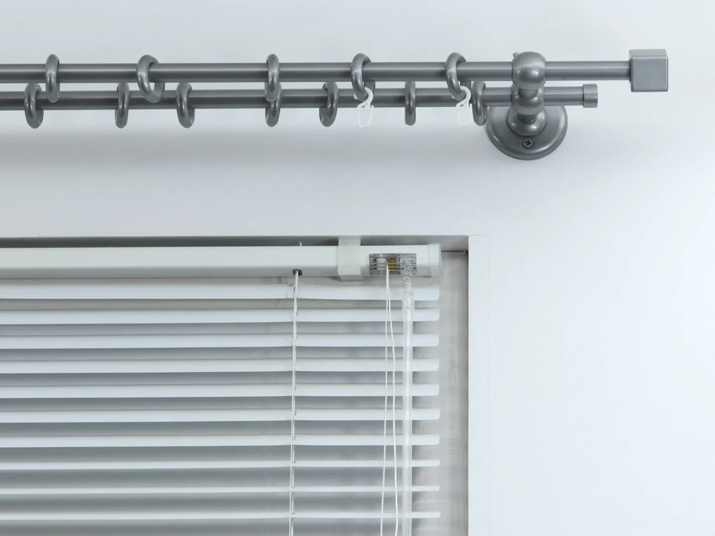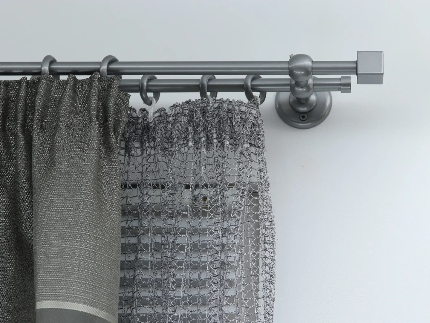 Double curtain rod for windows and doors with steel rings and plastic hooks.