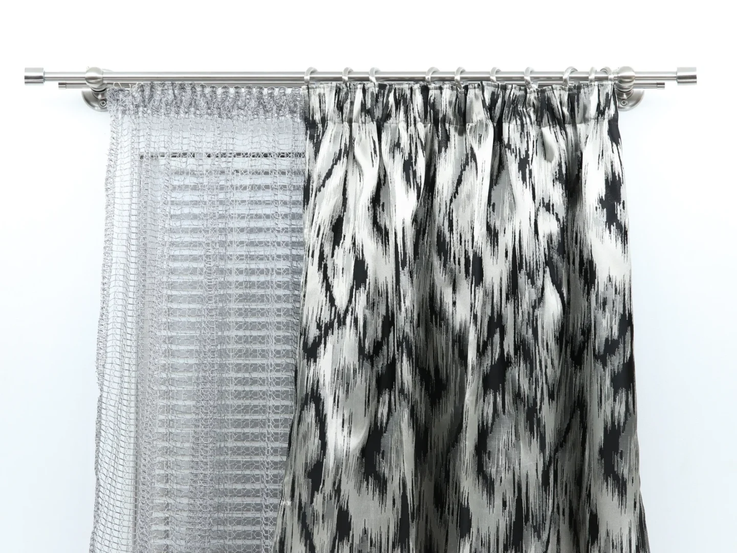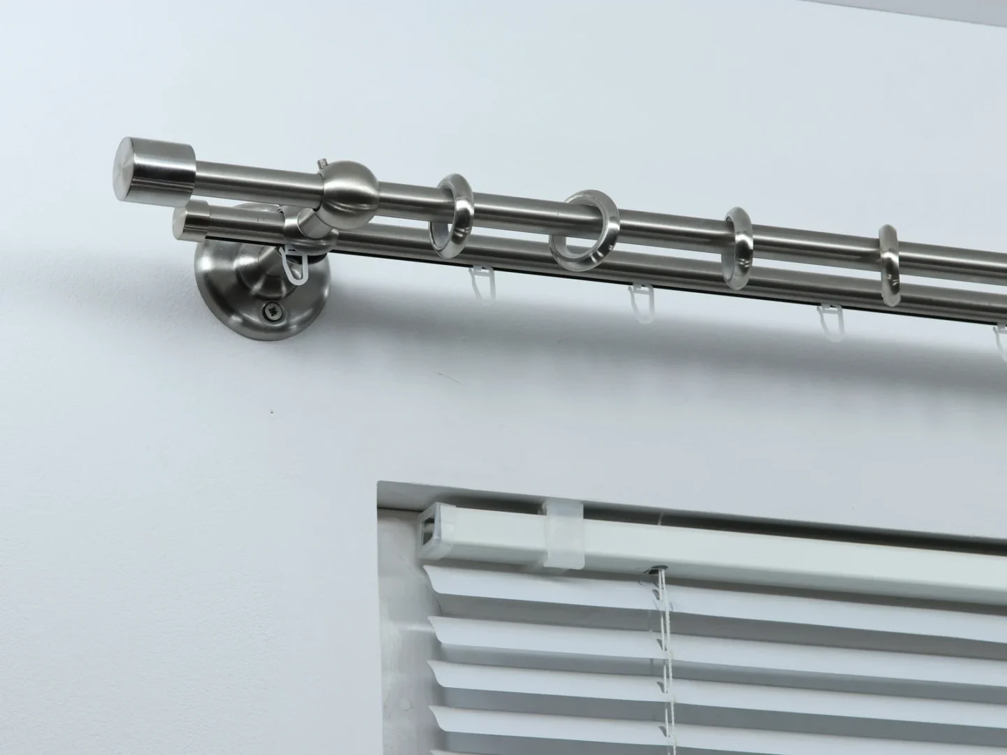 Double curtain rod & rail combination of equal thickness poles (rod- ø16mm and rail ø16mm in diameter) for windows and doors with steel rings and hooks + plastic rollers. This is a unique combination between a classic style curtain rod with metal rings (front) and a modern rail with hidden plastic sliders (back).
