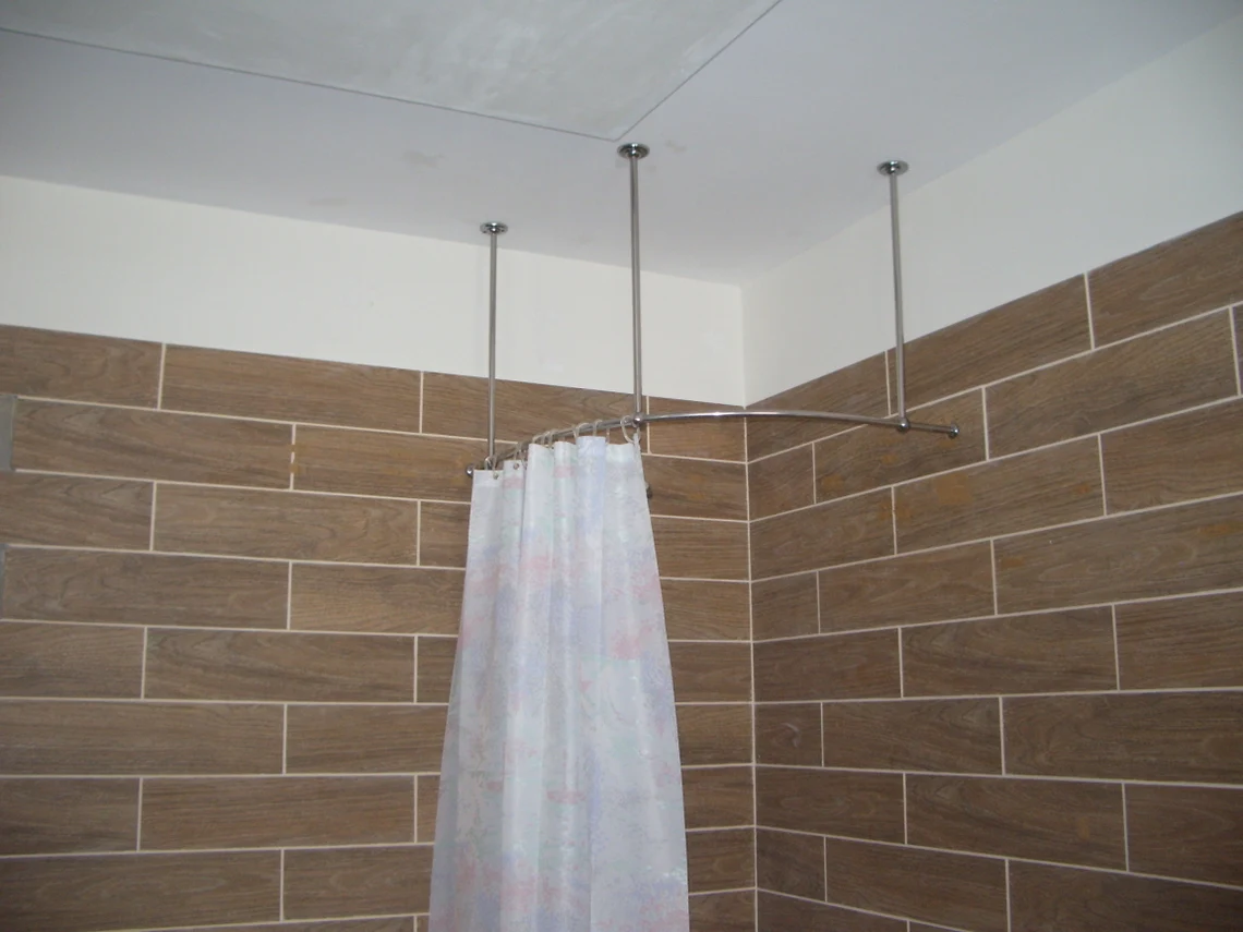 Stainless steel bathroom cornice that is mounted on the ceiling.